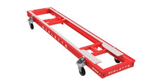 Wydłużona mobilna rama na kołach do naprawy dużych pojazdów dostawczych.